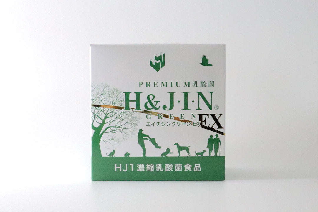 エイチジングリーンEXはH&J社独自の乳酸菌「HJ1乳酸菌」を1包に4000億個配合。全てが通常タイプの5倍以上の高配合バージョンです。